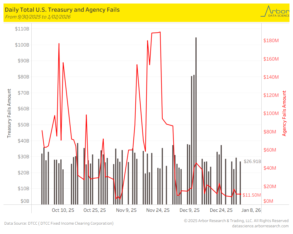 As of 1/06/2026, U.S. Treasury Fails were $26.91 billion and U.S. Agency Fails were $11.50 million.