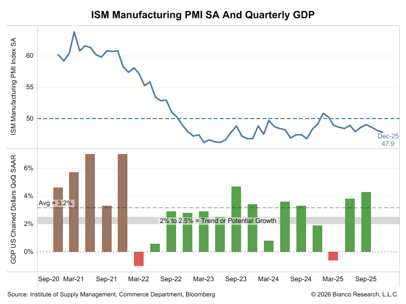 The headline above says ISM is at a 14-month low. But the chart above shows that the 47.9 level has been average since 2022.What does it mean for GDP? As this chart shows, the sub-50 level has occurred with many healthy green bars (decent GDP), so it is not a “warning” of a slowdown.