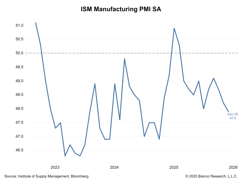 *US DEC. ISM MANUFACTURING AT 14-MONTH LOW OF 47.9; EST. 48.4
