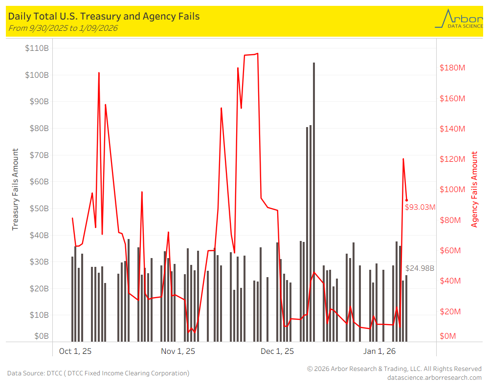 As of 1/09/2026, U.S. Treasury Fails were $24.98 billion and U.S. Agency Fails were $93.03 million .