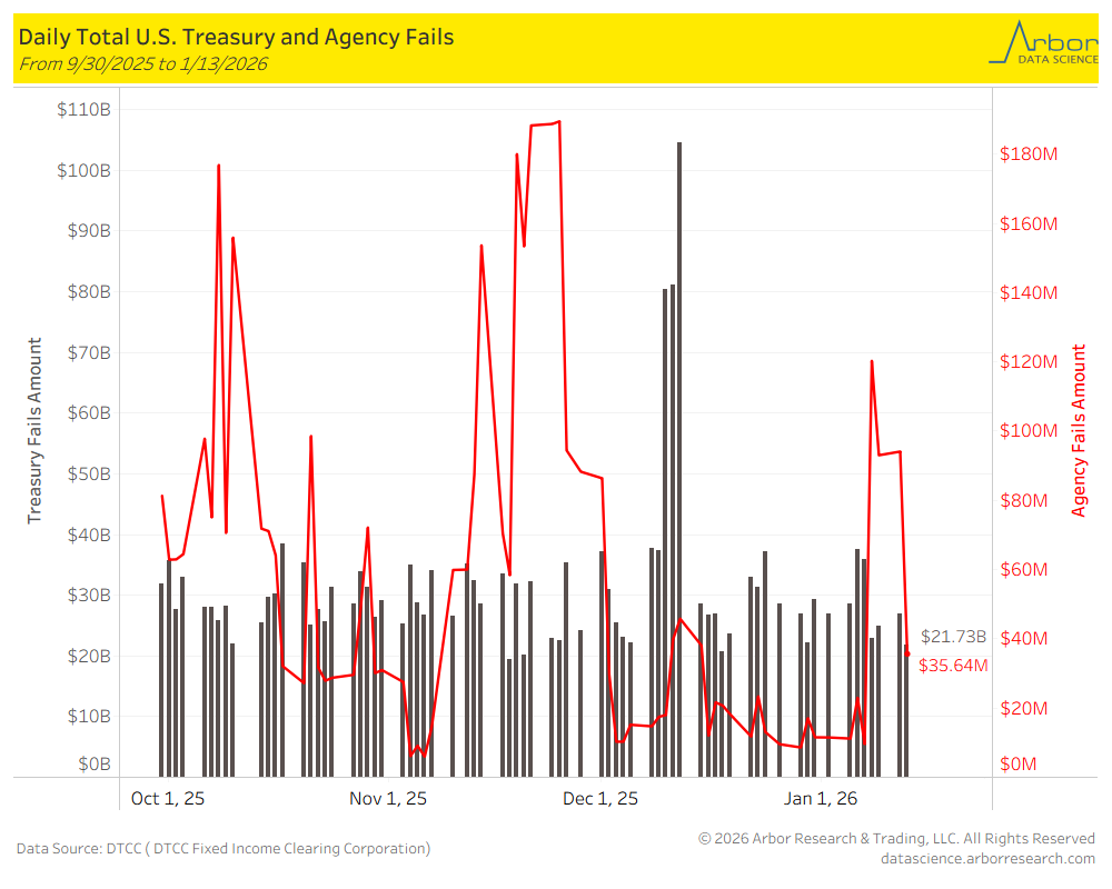 As of 1/13/2026, U.S. Treasury Fails were $21.73 billion and U.S. Agency Fails were $35.64 million .