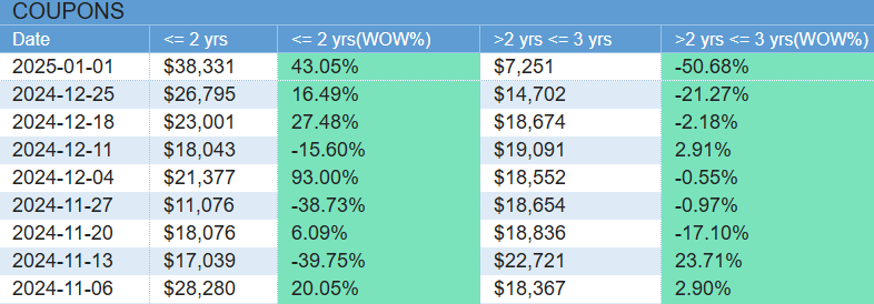 - Dealer positions in < 2yrs Coupons (as of 1/01) were up 11.53bln @38.33bln.