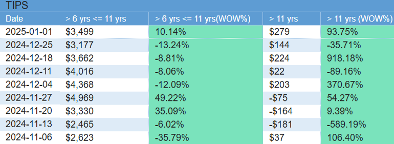 - Dealer positions in 6-11yrs TIPS (as of 1/01) were up 322mln @3.49mln.
