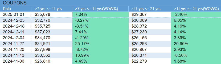 - Dealer positions in > 7 years and< 11yrs Coupons (as of 1/01) were down 2.30bln @35.07bln.