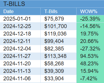 - Dealer positions in T-Bills (as of 1/01) were down 25.82bln @75.87bln