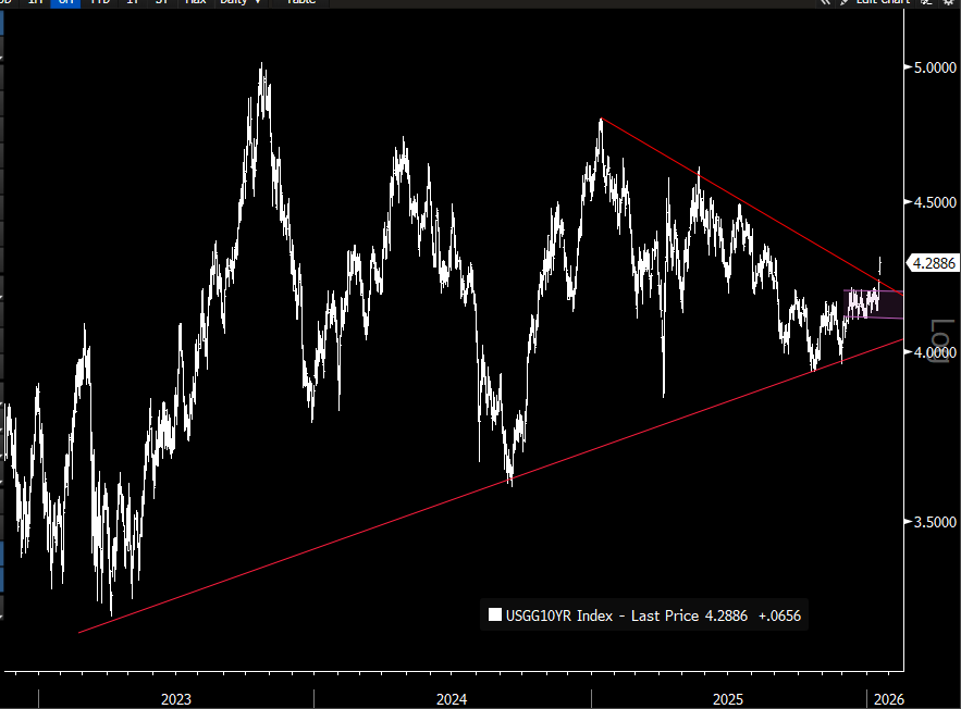 UST 10s on Tuesday (1/20/26) hit a high in yield of 4.305% and closed at 4.285% .