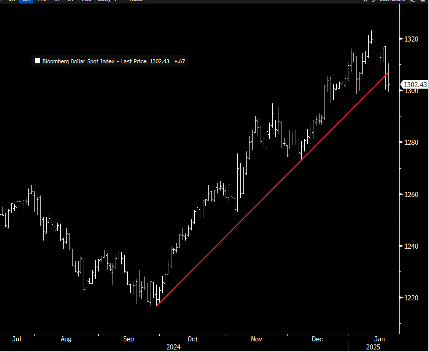 The dollar’s uptrend since September can now be questioned as it broke below the red line.
