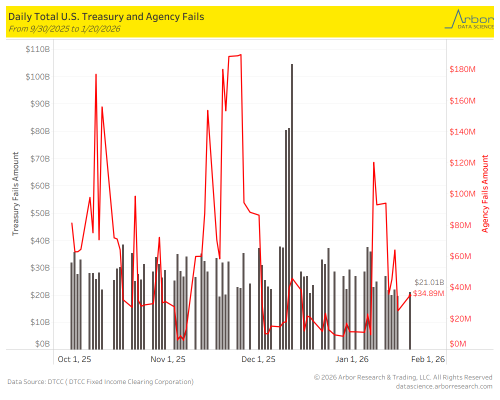 As of 1/20/2026, U.S. Treasury Fails were $21.01 billion and U.S. Agency Fails were $34.89 million .