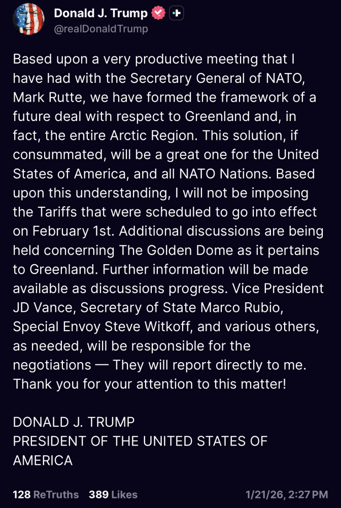 TRUMP SAYS U.S. HAS FORMED FRAMEWORK FOR FUTURE GREENLAND DEAL; SAYS FEB 1 TARIFFS WILL NOT GO INTO EFFECT; SAYS TALKS CONTINUE ON GOLDEN DOME AS IT PERTAINS TO GREENLAND