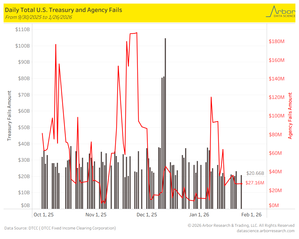 As of 1/26/2026, U.S. Treasury Fails were $20.66 billion and U.S. Agency Fails were $27.16 million.