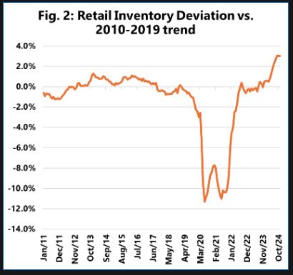 For some retailers, inventory buildup may be a hedge against coming tariffs. On the other hand, a potential implication is that if consumer spending suddenly is reduced due to the inflationary effect of tariffs, the retailers might well have excess inventory on their hands.