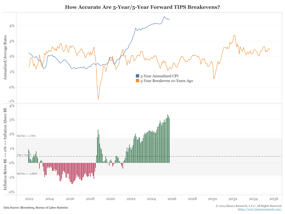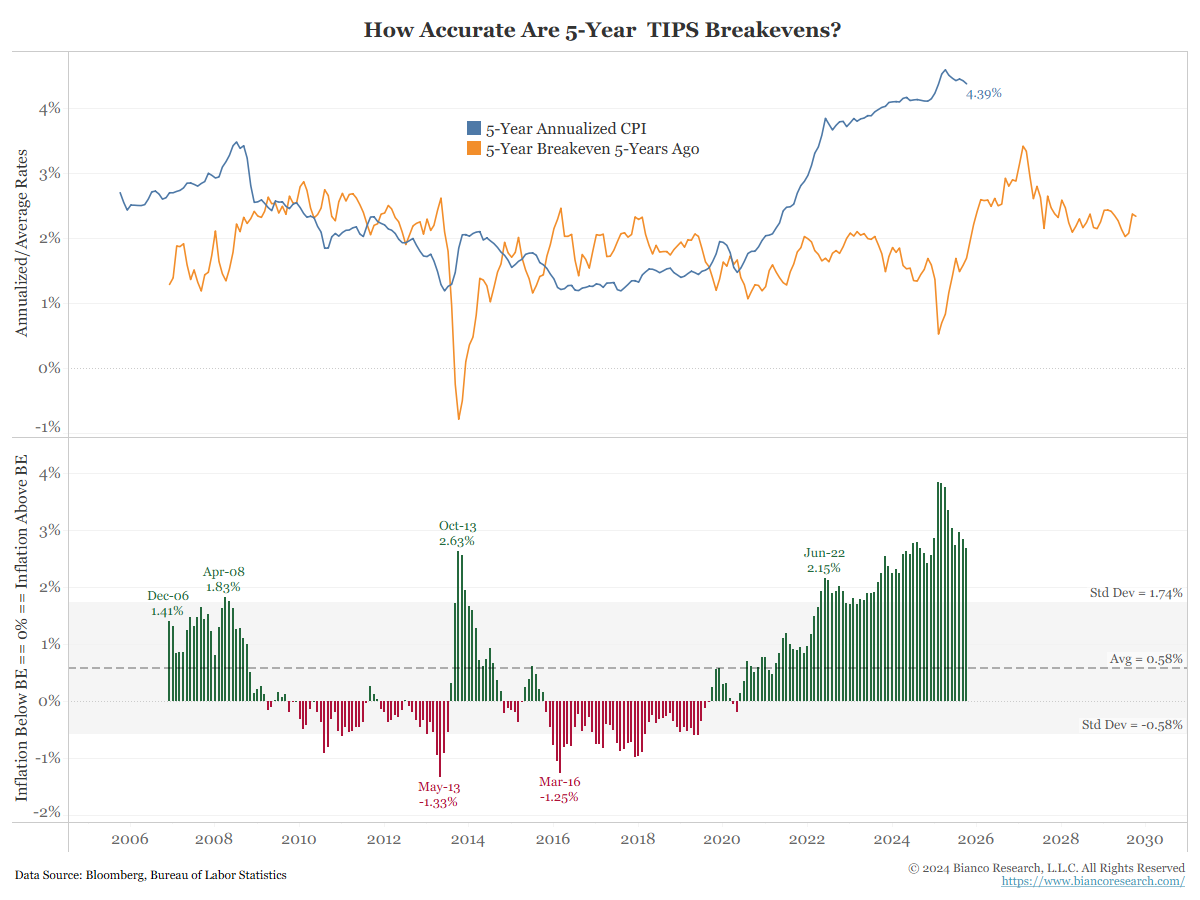 This chart shows the track record of the 5-year TIPS in predicting actual inflation.