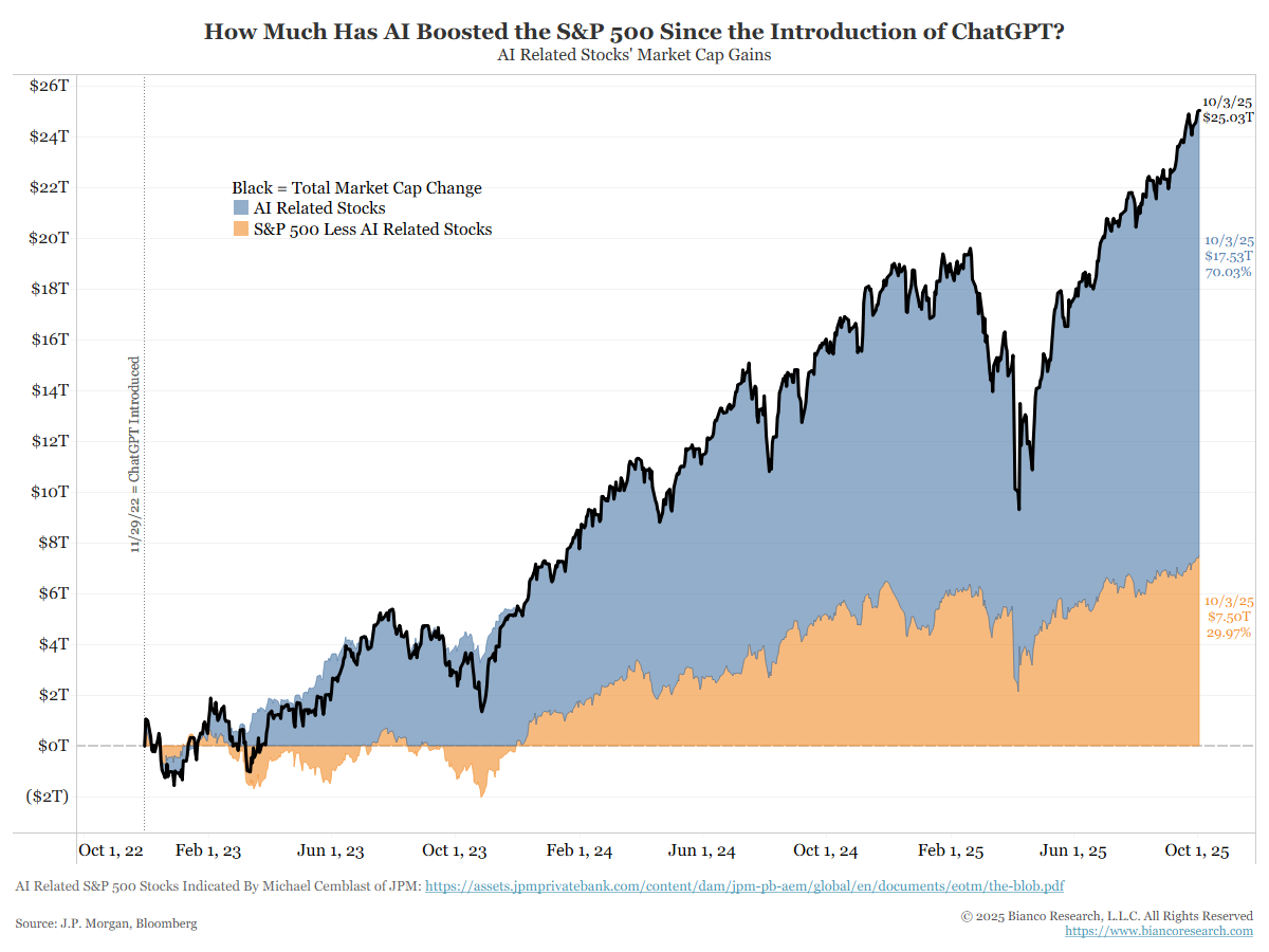 ChatGPT was released on November 29, 2022. Since this date, these 41 stocks have accounted for 70% of the increase in the S&P 500’s value (blue). The other 30% came from the remaining 359 stocks (orange).