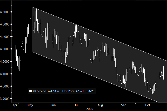 Services inflation? The 10-year yield market is reacting. 4.16%, up 7bps today. As this chart shows, it marches toward the top of the channel. 4.21% would mark the first “higher-high” in six months. Will it happen?