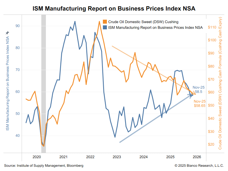 Typically, what drives prices paid is energy prices. They move together. But as these arrows show, crude oil prices (orange) have been falling as raw material prices (blue) have been rising.