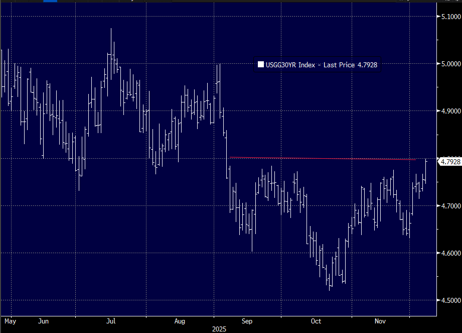 - Friday’s range for UST 30y: 4.75% – 4.80%, closing at 4.79%