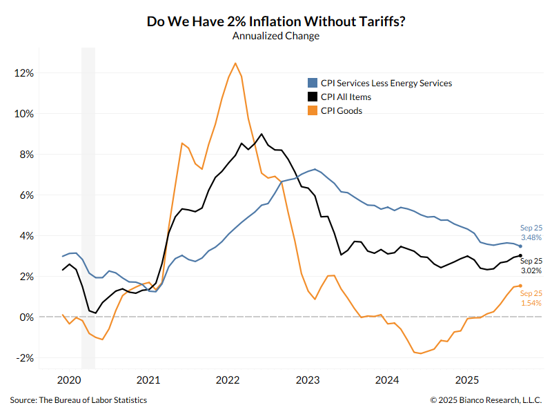 Jim Bianco: As this chart shows, services inflation has been falling for years. But nearly 6 years after the COVID recession ended (April 2020), services inflation is still 3.5%. This is not remotely close to “take out tariffs and we have no inflation.”.