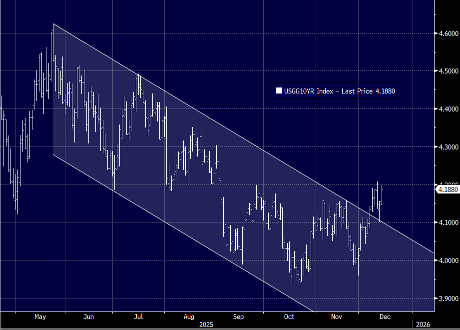 Yesterday, the 10-year yield traded down to 4.10%, testing the top end of this channel. It held, and now yields are back to 4.19%.