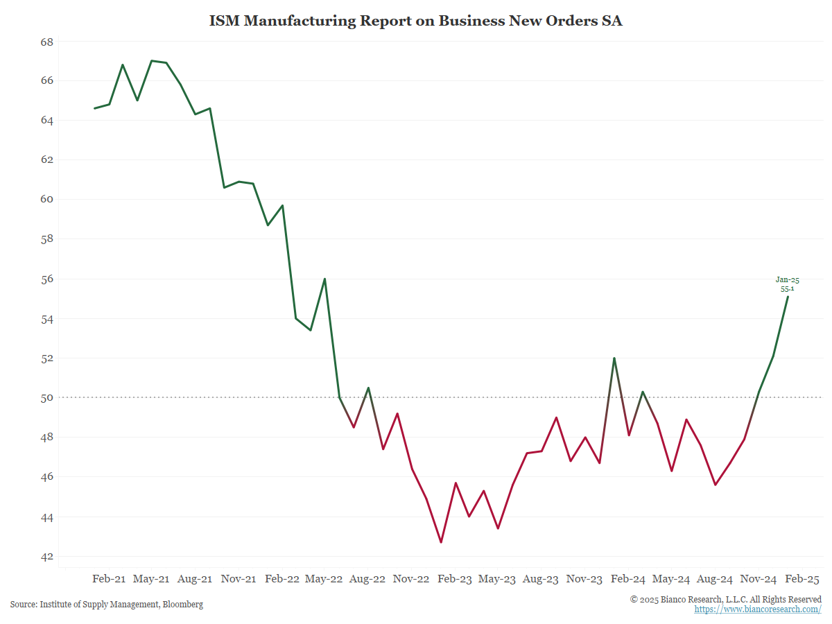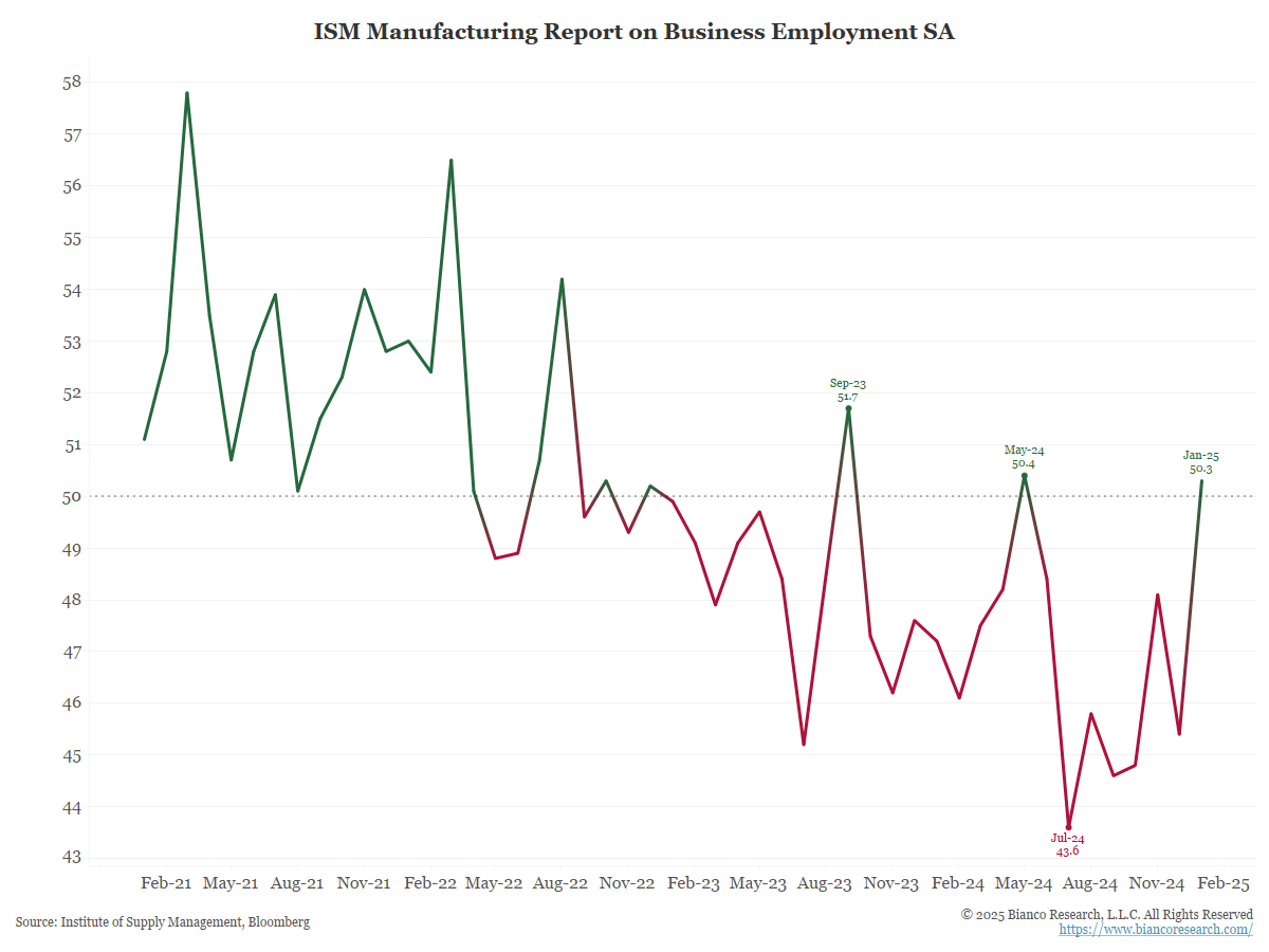 New Orders, considered a “leading indicator,” shot up. This is being dismissed as front-loading ahead of tariffs. So, a dip back down is expected in Feb/Mar.