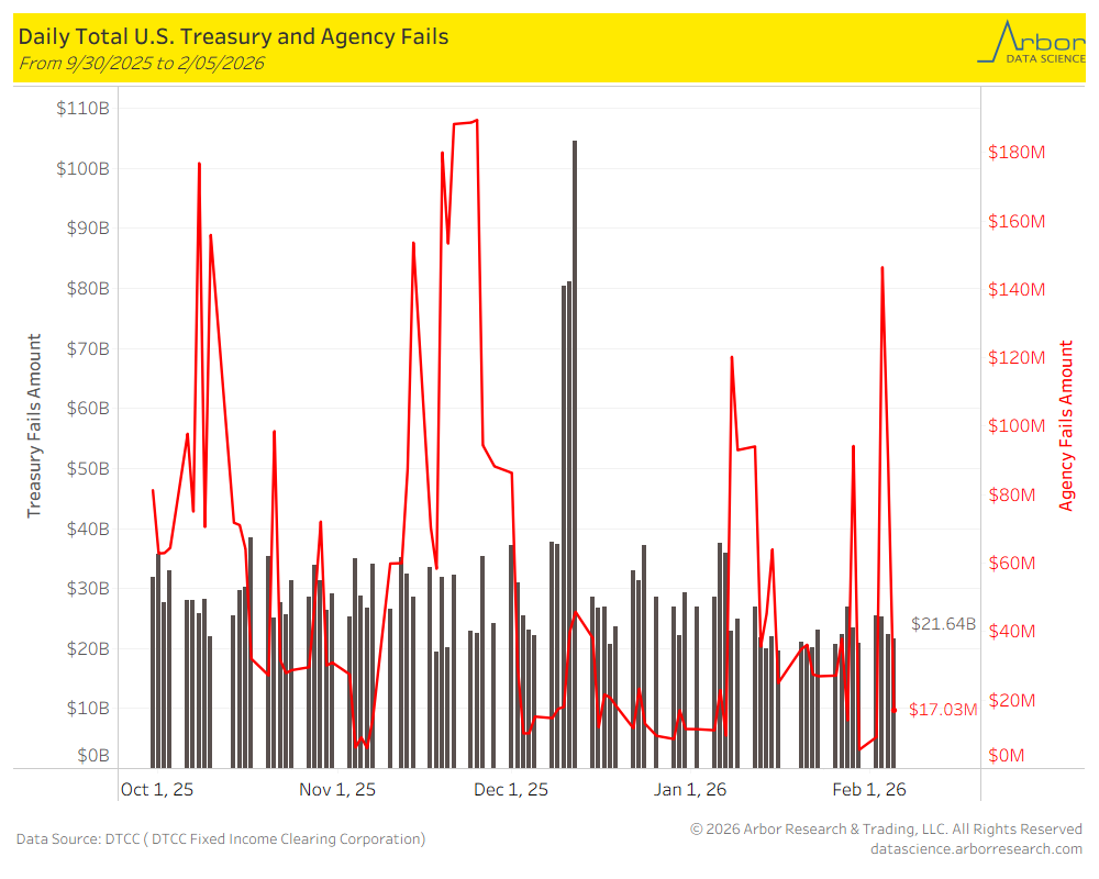 As of 2/05/2026, U.S. Treasury Fails were $21.64 billion and U.S. Agency Fails were $17.03 million.