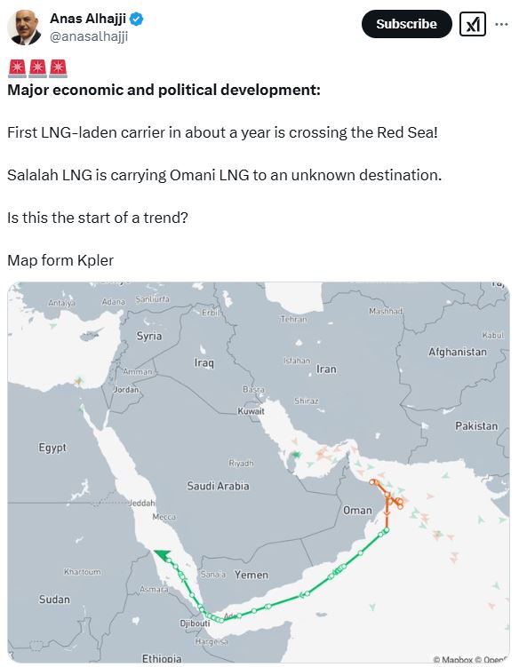 According to Anas Alhajji, managing partner at Energy Outlook Advisors, Salalah LNG has become the first liquefied natural gas (LNG) laden carrier to transit the Bab el-Mandeb Strait at the southern end of the Red Sea in nearly a year.
