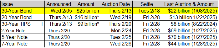 - Treasury auctions conclude the week with a $25 bln UST 30y Bond auction tomorrow, Thursday (2/13/25)