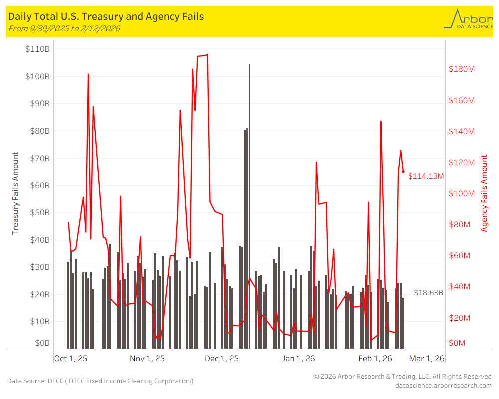 As of 2/12/2026, U.S. Treasury Fails were $18.63 billion and U.S. Agency Fails were $114.13 million.