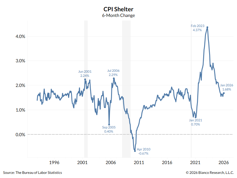 Remember, there was no October CPI (shutdown); they “carried forward” the September number, meaning they assumed 0.0% inflation (except for a few things they could get, like gasoline and used cars). This month’s decline was driven by a larger-than-expected drop in energy (read: gasoline), which fell 1.47% in January. So, when every state legislature and Congress is breathlessly trying to deal with soaring electricity prices, the BLS tells us energy inflation is collapsing. Go figure.