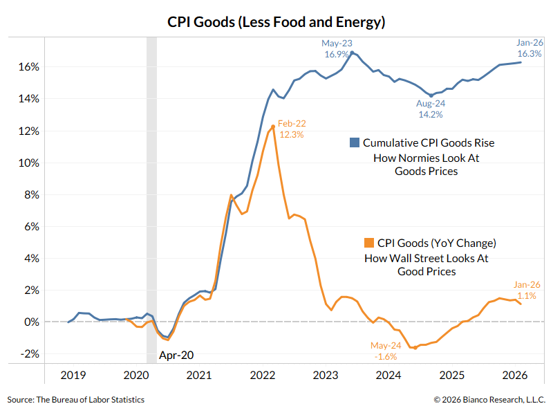 Regarding Tariffs, here is CPI Good (less food and Energy) measured two different ways. Cumulative (blue), which is how Normies view the world. Year-over-Year (Orange), which is how economists see the world. Both are right.