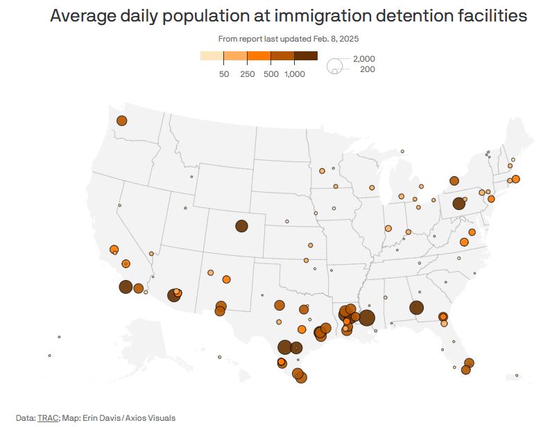 Facilities in Mississippi and Texas are holding the most detainees among the tens of thousands who’ve been rounded up across the nation during the ongoing crackdown on illegal immigration, according to newly released federal data.