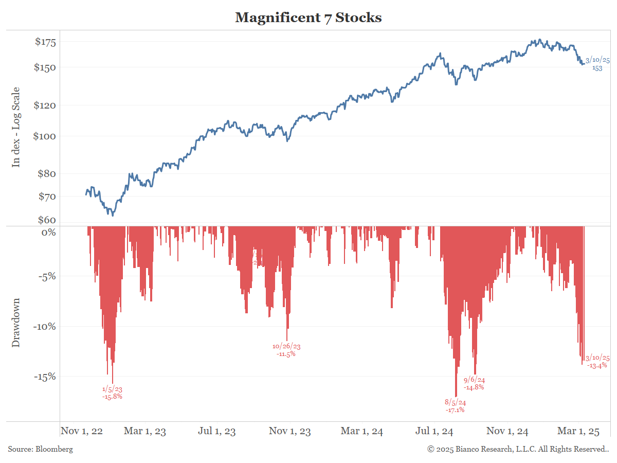 Finally, here are the Mag 7 stocks. As a group, they have corrected 13%. They are more volatile than the S&P 500.