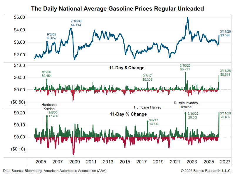 The chart below shows the national average retail gasoline price from an AAA Motor Club survey. Yesterday was day 11 since the war started on February 28.