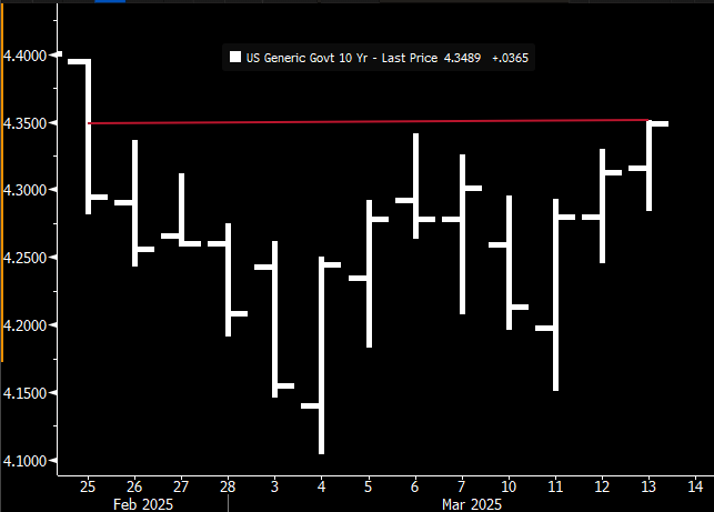 Bar chart of the 10-year yield. As I write, it reached 4.35%. This is the highest yield since February 25.