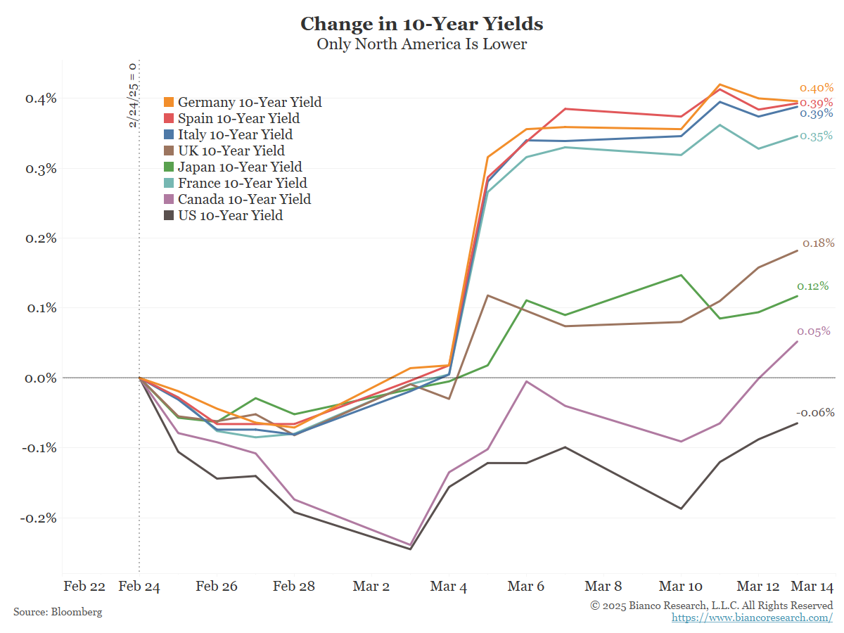 Since February 24, developed world 10-year yields are soaring. Only the US is lower, but only 6 bps now.