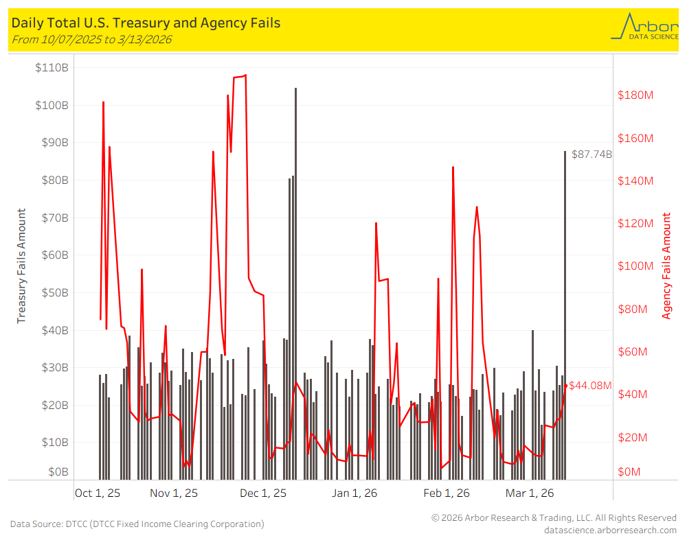 As of 3/13/2026, U.S. Treasury Fails were $87.74 billion and U.S. Agency Fails were $44.08 million .