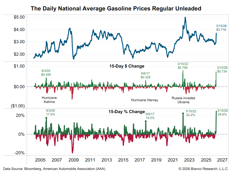 National average of gas prices is up 73 cents since the war started 15 days ago (middle panel), or 25% (bottom panel).
