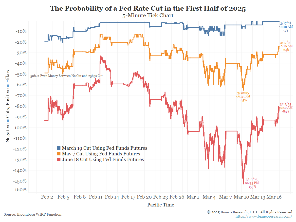 The June probability at 83% (17% hold) will deflate to zero if they don’t cut in May. (To be clear, something else unexpected would have to come along to get the Fed to cut.)