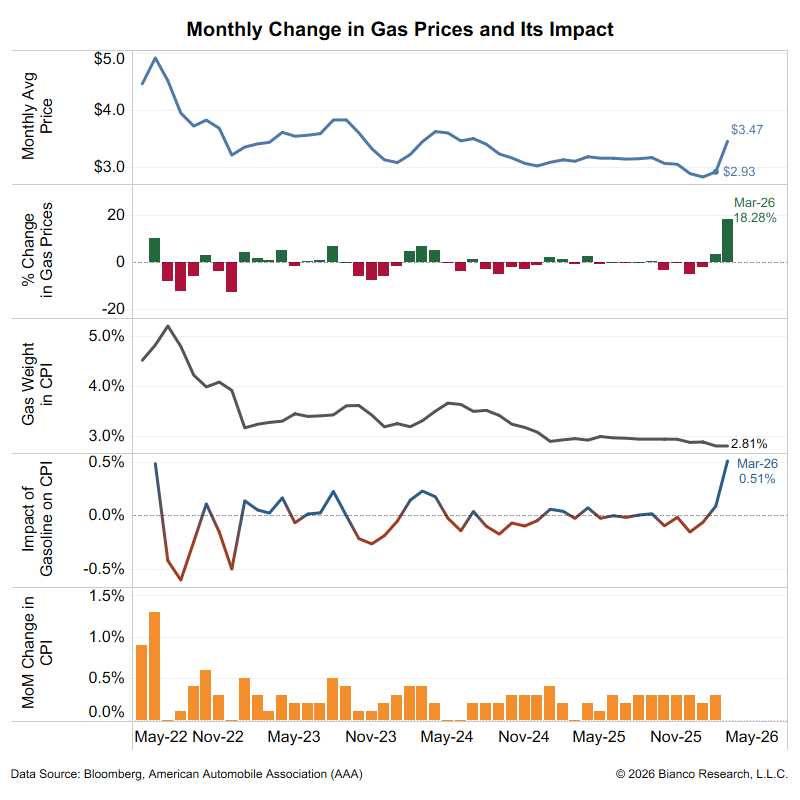 The fourth panel is gasoline’s impact on the monthly CPI. It is simply multiplying its monthly change (second panel) by its weight (third panel). It is suggested that gasoline ALONE will add 0.5% to CPI.
