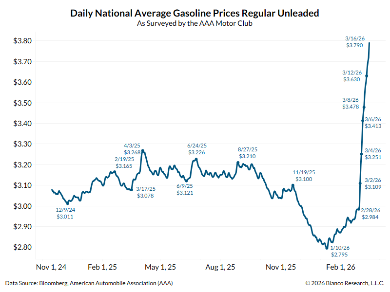The second panel shows how much gasoline prices have changed. This is the average from February to March average to date. Gasoline prices are up 18.28% to date. Again, the last reading (March 16) is about 30 cents higher, so this will continue to go up.