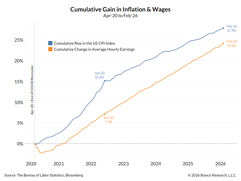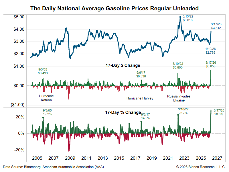Yesterday was day #17 of the war. The national average of gasoline is up 86 cents (middle panel) or 28.8% (bottom panel).