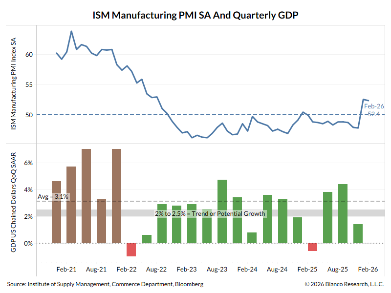If ISM is supposed to tell us about the economy, are the recent readings north of 50 (top panel) signaling big jumps in GDP (bottom panel)?