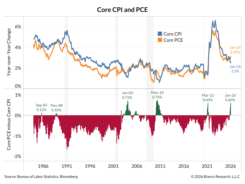 I plugged in 3.1% for January YoY core PCE into the chart below, and it shows YoY core PCE is now running 0.6% ABOVE YoY Core CPI. It is very close to a 40+ year extreme.