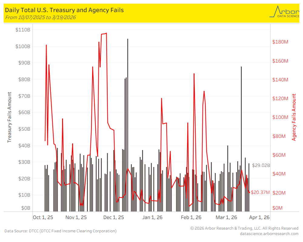 As of 3/19/2026, U.S. Treasury Fails were $29.02 billion and U.S. Agency Fails were $20.37 million.