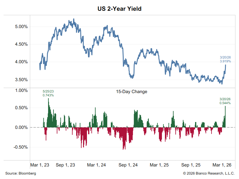 The war started three weeks ago (15 trading days). The 2-year is now up 54.4 bps over this period.