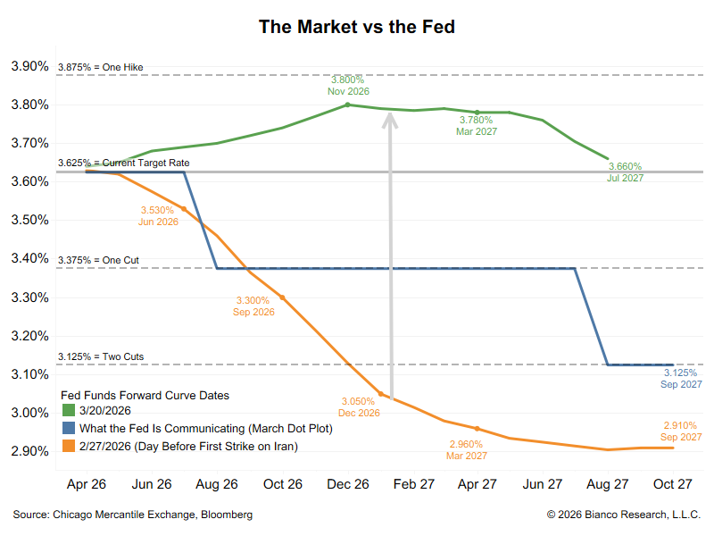 Orange = the forward Fed funds curve the day before the war. Blue = what the Fed dots say they expect to do. Green = forward curve today.