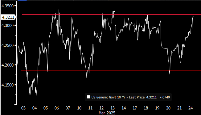 - Monday’s range for UST 10y: 4.27% – 4.33%, closing at 4.325%
