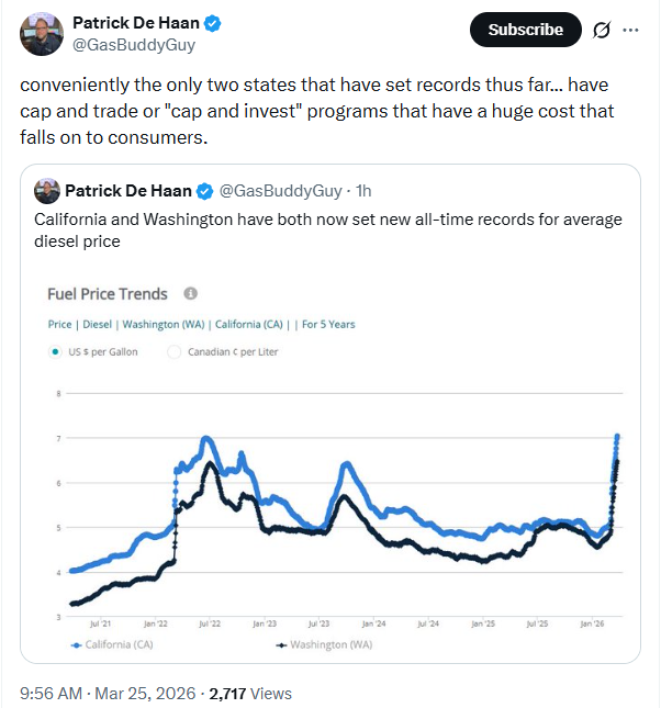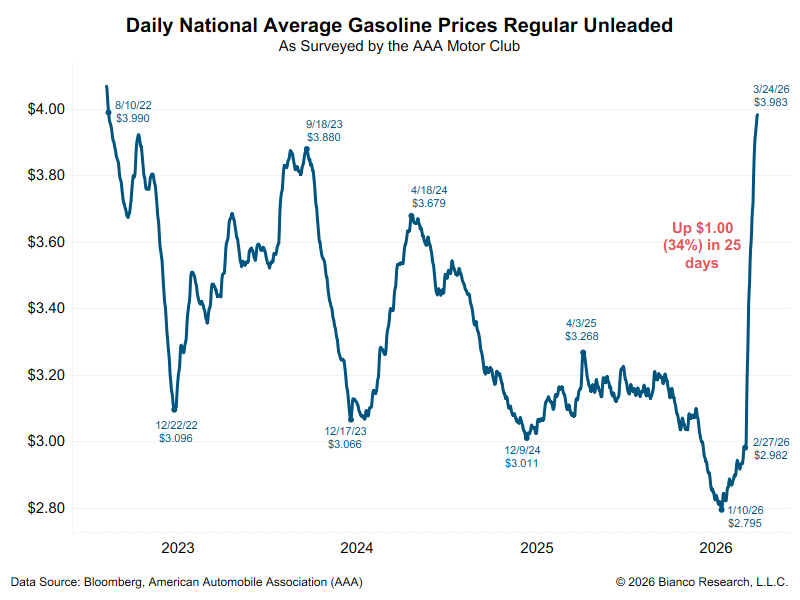 The national average of gasoline prices is now up exactly $1.00 (34%) since the war began 25 days ago.
