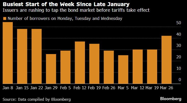 Borrowers are piling into bond markets to get deals done ahead of US President Donald Trump’s plans to impose global tariffs on April 2.
