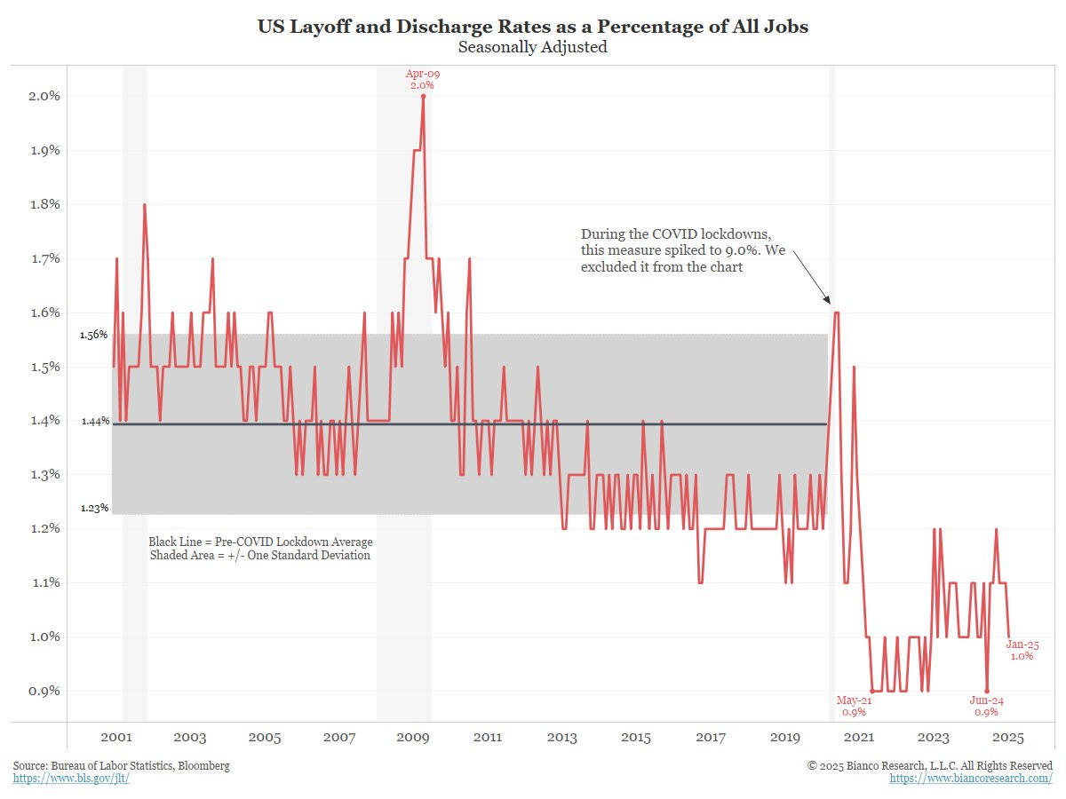 Excluding retail, DOGE and Gov’t contractors (also DOGE), the rest of the economy is experiencing low levels of job cuts. Layoffs as a percentage of the workforce remain near historic lows.