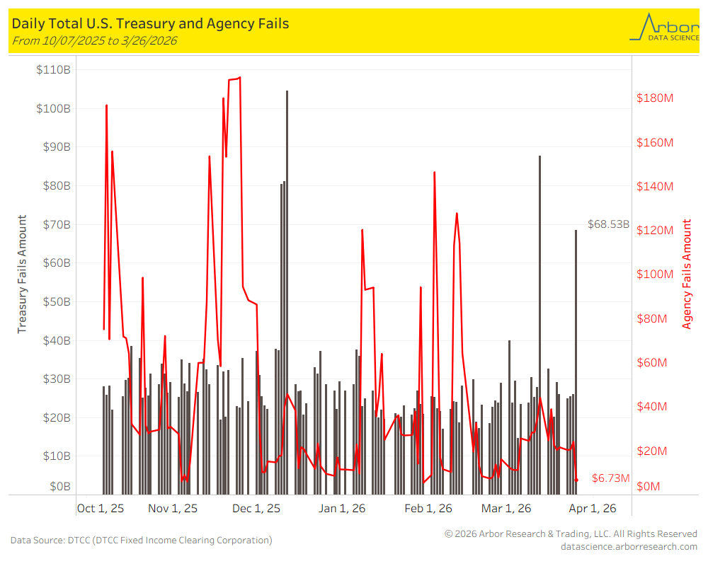 As of 3/26/2026, U.S. Treasury Fails were $68.53 billion and U.S. Agency Fails were $6.73 million.
